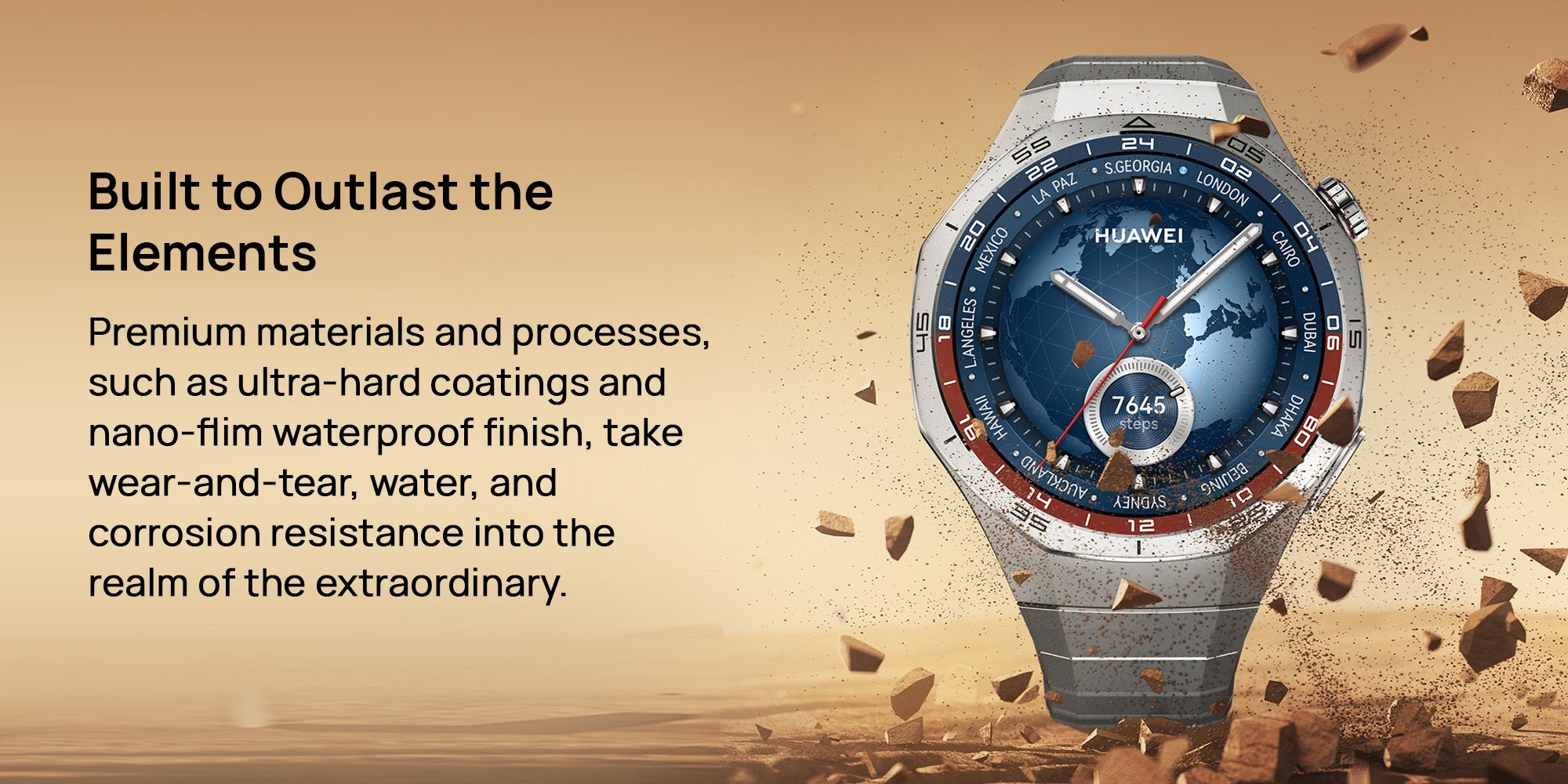 The Huawei Watch GT 5 Pro 46mm is designed for those who demand a sophisticated look, durability, and top-tier performance. It features a sharp-edged design crafted with aerospace-grade titanium alloy and a fluoroelastomer strap, ensuring a premium feel and long-lasting wear.