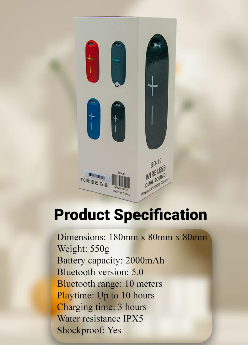 Overall, the Wireless Dual Sound BD19 is a great choice for anyone looking for a portable wireless speaker with great sound quality and a number of features that make it ideal for use on the go.